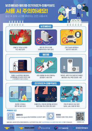 [환경일보] 한국소비자원(원장 윤수현)은 국가기술표준원(원장 김대자), 한국전기안전공사 (사장 남화영), 소방청(청장 직무대행 김승룡), 경남소방본부(본부장 이동원)와 함께 ‘보조배터리·멀티탭·전기자전거·전동킥보드 화재사고 예방 캠페인’을 실시한다.최근 휴대용 기기와 개인 이동수단의 보급이 늘어나면서 보조배터리, 멀티탭, 전기자전거, 전동킥보드가 일상생활 속에서 널리 사용되고 있다. 하지만 부주의한 사용이나 부적절한 환경에서의 충전·보관은 화재 사고로 이어질 수 있어 각별한 주의가 필요하다.이에 캠페인 참여 기관은 ▷고온·다습한 환