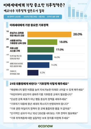 [환경일보] 박정미 기자 = 미래세대를 위해 국민이 21대 대통령에게 바라는 기후 정책은 에너지 전환과 기후환경 교육 강화인 것으로 나타났다.환경단체 에코나우(대표 하지원)에 따르면 지난 5월 28일부터 6월 8일까지 12일간 실시한 온라인 설문조사 결과 ▷‘온실가스 감축을 위한 에너지 전환’이 28.0%로 1위, ▷‘사람을 바꾸는 기후환경 교육 강화’가 18.8%로 2위, ▷‘자원 순환 시스템 구축’이 17.0%로 3위로 나타났다. 이번 설문은 총 1,023명이 참여