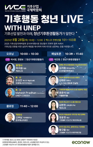 [환경일보] 박정미 기자 = 환경단체 에코나우(대표 하지원)는 2025 기후산업국제박람회(WCE, World Climate Industry Expo)의 공식 부대행사인 미래세대 세션 ‘기후행동 청년 Live with UNEP’을 28일 부산 벡스코에서 개최한다고 밝혔다.이번 미래세대 세션은 ‘기후산업 발전과 미래’를 주제로 청년기후환경활동가들이 직접 목소리를 내고 실질적인 기후행동 방안을 모색하는 자리다. 특히 청년들은 기후위기 해결의 주체로서 지속가능한 미래를 위한 구체적인 대안을 제시할 예정이다.이번 행사는 유엔환경계획(UNEP