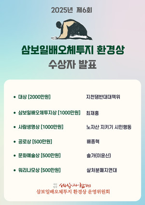 [환경일보] 사단법인 세상과함께(이사장 유연 스님)가 주관하는 2025년 제6회 삼보일배오체투지 환경상(이하 오체투지 환경상) ‘대상’ 수상단체로 지천댐반대대책위원회가 선정됐다. ‘삼보일배오체투지상’은 최재홍 변호사, ‘사람생명상’은 노자산지키기시민행동이 각각 수상했다.2015년에 창립한 (사)세상과함께는 그동안 미얀마 학교 건립 및 어린이 돕기 등 해외 빈곤층의 삶의 질 향상과 국내 장애인 돕기 운동 등을 활발하게 진행해 왔다. 2020년부터 순수 민간 기금으로 운영하는 오체투지환경상을 제정해 전국에서 고군분투하는 환경운동가들을