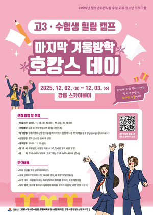[환경일보] 강릉시(시장 김홍규)는 수능을 마친 청소년들이 지친 마음을 달래고 자신을 돌아보는 2025 청소년수련시설 수능 이후 청소년 프로그램 ‘고3·수험생 힐링캠프 마지막 겨울방학 호캉스 데이’를 개최한다.이번 프로그램은 12월 2일(화)부터 3일(수)까지 강릉 스카이베이 호텔에서 1박 2일 일정으로 진행되며, 관내 고3 및 수험생 50명(2인 1팀, 25팀)을 대상으로 한다. 참여 청소년들은 사연 심사를 통해 선발되며, 신청 기간은 11월 18일(화)부터 26일(수)까지이다.운영 프로그램은 ▷마음 온(溫)힐링 ▷쉼표 ▷리셋 데