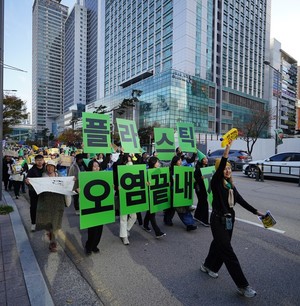 [부산=환경일보] 장가을 기자 = “플라스틱 싫은 사람, 일회용품 싫은 사람 모여라. 화석연료 싫은 사람, 기후위기 싫은 사람 모여라~” 가수 배철수의 ‘모여라’를 개사한 노래를 선창하자 따라 부른다. 꽹과리와 소고 연주에 어깨를 들썩이고 블랙핑크 로제의 ‘아파트’가 흘러나오자 춤을 추는 이들. 피부색과 국적, 성별과 나이, 관심사는 천차만별이지만 전 세계와 전국 각지에서 ‘플라스틱 제로’로 하나 된 이들이 결집했다. 11월23일 오후 2시 부산 해운대구 올림픽공원은 ‘플라스틱 생산 감축’을 요구하는 1000여 명의 평화 행진 참여