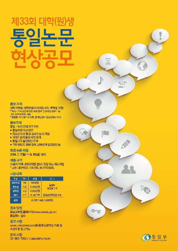 [환경일보] 박미경 기자 = 통일부 통일교육원은 대학사회 내 통일·북한 문제에 대한 학문적 관심을 높이고 연구 분위기를 확산시키기 위해 7월7일부터 9월19일까지 ‘제33회 대학(원)생 통일논문 현상공모’를 개최한다고 밝혔다.