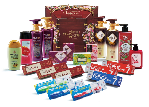 구성은 리엔 효윤비책 샴푸/컨디셔너, 오가니스트 샴푸, 온더바디 퍼퓸 바디워시, 온더바디 비누, 리엔 비누, 페리오 칫솔, 죽염 영지고 치약, 페리오 토탈 세븐 치약, 엘라스틴 퍼퓸 샴푸/컨디셔너 등 총 23종이다.