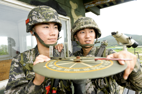 형 박누리병장(우)이 동생 박누가일병(좌)에게 경계작전간 노하우를 가르치고 있다. |