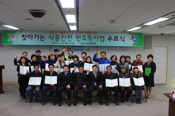 [수원=환경일보] 차영환 기자 = 수원시(시장 염태영)는 지닌 27일 시청 별관 중회의실에서 ‘2014년 찾아가는 식품안전 멘토링 사업 수료식’ 을 개최했다.