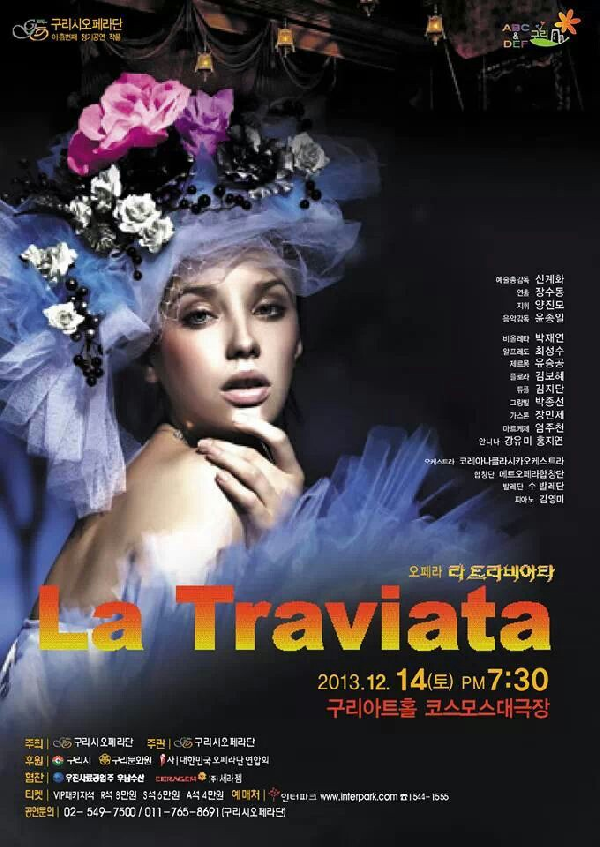 이번에 오페라 소극장부문 우수상을 받은 ‘라 트라비아타’는 지난 2013년 12월 14일에 구리아트홀 코스모스대극장에서 공연된 작품으로 영화 <귀여운 여인>에서 줄리아 로버츠가 눈물을 흘리며 리챠드 기어와 함께 보던 오페라로도 유명하다. 뒤마의 소설 〈춘희 La Dame aux camélias〉를 소재로 F. M. 피아베(1810~76)가 대본을 썼으며, 1853년 3월 6일 베네치아에서 초연된 이 작품은