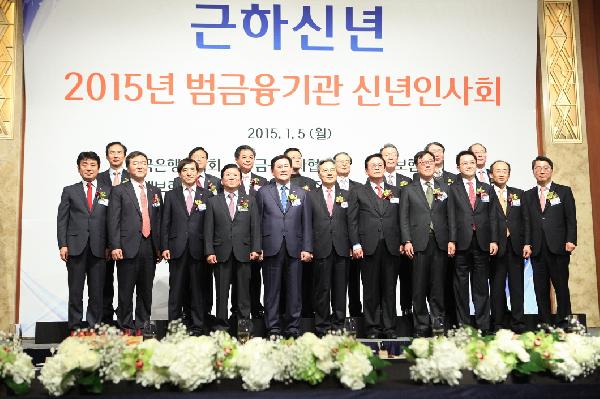 새해 첫 월요일인 1월5일 서울 롯데호텔에서 개최된 ‘2015년 범금융기관 신년인사회’에서 이주열 한국은행 총재는 “지난해 금융회사 지배구조를 둘러싼 논란과 연이어 발생한 개인정보 유출사건으로 금융을 바라보는 국민들의 시선이 따가워진 것은 사실”이라면서도 “이런 어려움들을 뒤로 하고 기쁨과 보람에 가득찬 미래가 펼쳐지기를 기대한다”고 말했다. 사진 아랫줄 좌측 3번째 이주열 한국은행 총재. <사진제공=은행연합회> |