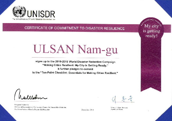 이에 남구는 「UNISDR 기후변화와 재해에 강한 도시만들기 캠페인」 활성화를 위하여 재해경감을 위한 제도적․행정적 기반 구축, 사회기반시설 보호개선, 재해위험평가 자체진단 등 10가지 필수사항에 대하여 자체계획을 수립해 실행하게 된다.