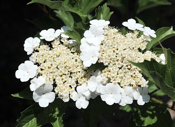 백당나무(접시꽃나무) Viburnum sargentii Koehne 우리나라 산록의 습지 및 골짜기에 자라는 낙엽관목으로 높이 3m 가량 자란다. 잎은 마주나며 3갈래로 양쪽 갈래가 옆으로 벌어지고 끝이 뾰족하며 뒷면에 짧은 털이 있다. 꽃은 취산화서로 햇가지 끝에 붙으며 가장자리의 꽃은 중성화로 황백색, 지름 3cm, 5갈래, 가운데의 것은 양성화이다. 개화기는 5월에서 6월 사이에 핀다.