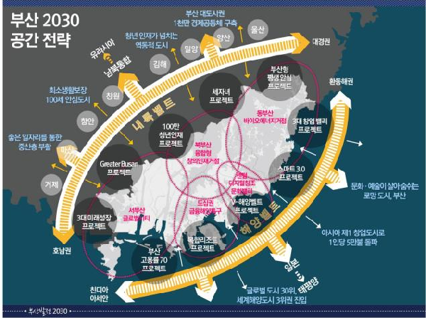 부·울·경을 하나의 공동체로 연결하는 ‘Greater Busan 프로젝트’도 눈여겨볼만 하다. 부울경은 지리적으로 인접할 뿐만 아니라 경제산업 구조도 유사해 상생협력의 조건을 갖추고 있지만, 신공항과 남강댐 등 서로간의 이해관계가 맞물려 아직까지 가시적인 성과를 내지 못하고 있는 실정이다. 이번 계획에서는 광역교통망 건설을 비롯하여 동남권 연구개발 협업, 경제공동체 협의기구 설립 등을 통해 부·울·경을 하나의 생활권으로 묶어 글로벌 메가시티의 초석을 다지는 것을 목표로 하고 있다. 나아가, 유라시아 기종점 인프라 건설과 남북해상로 연결을 추진해 환동해 경제권의 중심도시로 발돋움하는 것도 ‘Greater Busan’의 개념에 포함된다.