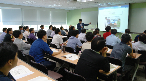 수원 삼성전자 상생협력아카데미에서 열린 '2015년 기술이전 박람회'에서 부산대학교 김우용 교수가 삼성전자 협력사 임직원들에게 IoT 관련 기술을 소개하고 있다. <사진제공=삼성전자> |