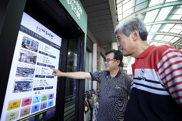 추석 명절을 앞두고 문산자유시장을 찾은 손님들이 LG디스플레이의 47인치 커머셜 디스플레이를 통해 시장, 상점 등 다양한 정보를 한 눈에 찾아보고 있다. |