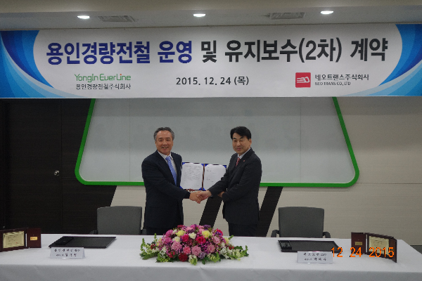 용인경량전철㈜은 24일 처인구 삼가동 소재 용인경량전철 대회의실에서 네오트랜스(주)와 관리운영 계약을 체결했다고 밝혔다. 이에 따라 네오트랜스㈜는 내년 7월말부터 7년간 용인경전철 운영을 맡게 된다.