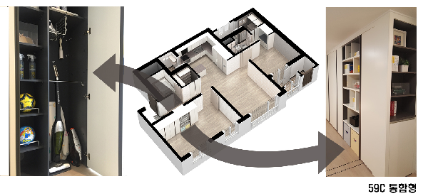 그리고 수납장 안의 다리미 전용 거치대는 높은 선반에 부착하여 어린 자녀의 손에 닿지 않도록 했다. 이 같은 양면 수납공간은 견본주택 59C타입에서 확인할 수 있다.
