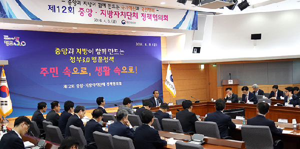 행정자치부(장관 홍윤식)는 8일 오후 3시 30분 정부서울청사 별관 국제회의장에서 ‘제12회 중앙·지방 정책협의회’를 개최했다. 홍윤식 행정자치부장관 주재로 진행된 이날 회의에는 행정자치부, 미래창조과학부, 농림축산식품부, 국민안전처 등 관계부처 실·국장과 17개 시도의 부시장·부지사가 참석했다.