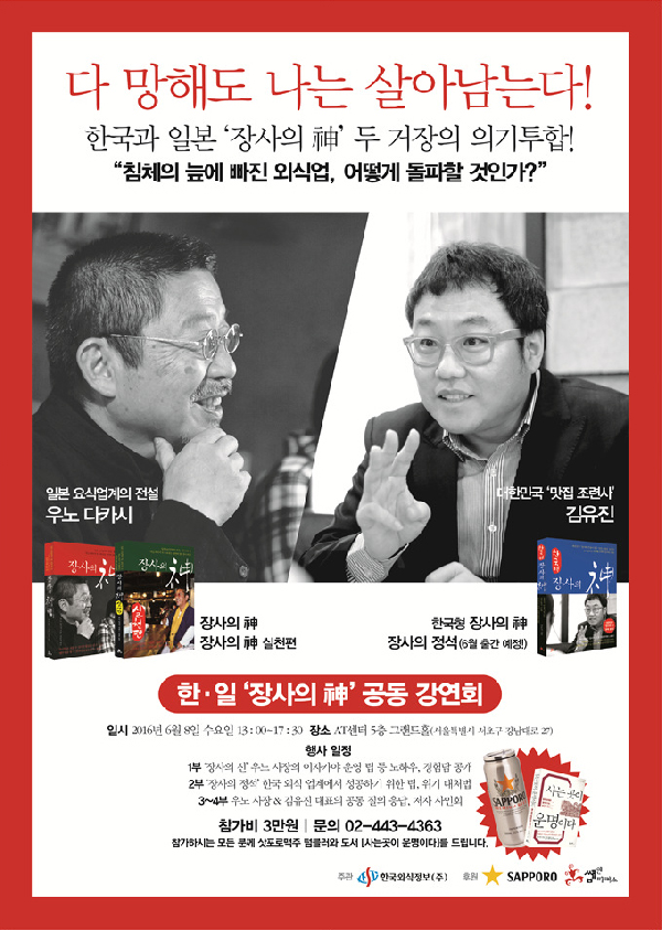 6월8일 수요일 AT센터 5층 그랜드홀에서 진행 되는 ‘한, 일 장사의 신 공동 강연회’는 위기 속의 한국 외식업계에 활력을 불어넣어 줄 일본과 한국의 콜라보레이션 강연으로, 일본 장사의 신 ‘우노 다카시’ 사장과 한국 장사의 신 ‘김유진’ 대표가 강연을 진행한다.