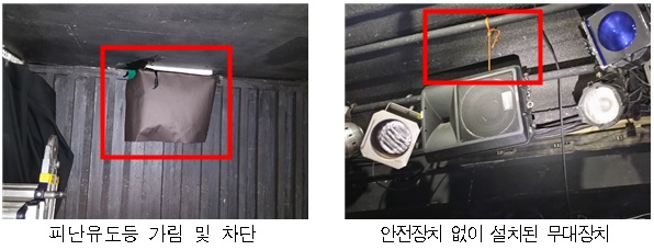 한편, 제도개선이 필요한 3건은 ①공연장 무대부의 화재발생 시 객석 쪽으로 연소확대 방지를 위한 방화막 설치기준의 마련 ②새로운 공연작품 등을 위해 일정규모 이상의 무대시설 변경 시 안전성 확인·점검절차 마련 ③영화관과 같이 공연장에도 공연시작 전 피난안내 영상 또는 방송 의무대상으로 법령 개정이 필요한 실정이다.