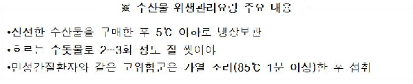 또한 지역 수협과 지자체에 여름철 수산물의 위생·관리 요령 포스터 5000부를 제작·배포했으며 언론 매체를 통해 여름철 수산물을 조리하거나 먹을 때 숙지해야 하는 위생관리요령을 홍보할 예정이다.