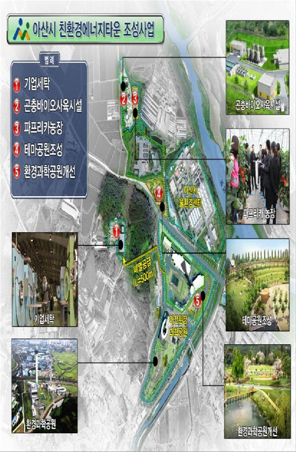 아산 친환경에너지타운은 생활폐기물 소각장의 폐열, 가축분뇨시설의 바이오가스 발전 폐열을 세탁공장, 곤충사육농장, 고소득 작물 재배 온실에 공급할 예정이다.