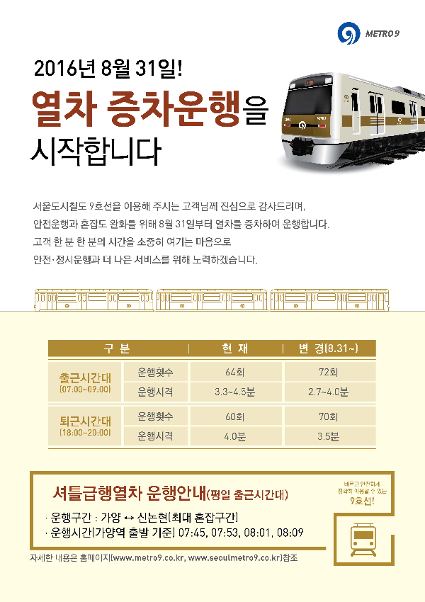 현재 지하철 9호선은 144량(36편성)이 운행되고 있으며, 이번 증차를 통해 총 160량(40편성)으로 늘어나게 된다. 이번에 증차되는 16량으로 9호선 전체의 혼잡도를 200% 이하로 낮추기 위해서 다양한 대안들을 검토했고, 최종적으로 혼잡이 극심한 출근시간대에 셔틀형 급행열차 대안을 선택해 시행하게 됐다. 서울시는 특히 승객이 집중되는 출․퇴근시간대에 열차가 집중 투입될 수 있도록 운행 계획을 수립했다.