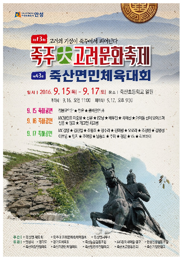 죽주대고려문화축제는 올해로 13번째를 맞이하는 연중 죽산면의 최대 축제로 매년 지역민의 화합의 장이 되고 있으며 특히 올해의 축제는 43회째를 맞는 죽산면민체육대회를 함께 진행함으로써 그 의미를 더했다.