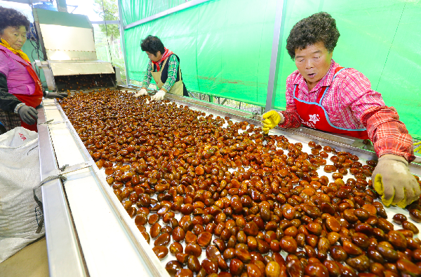 [산청=환경일보] 강위채 기자 = 지난 21일 경상남도 산청군 신안면 산청군농산물유통센터 직원들이 갓 수매한 햇밤을 씻고 있다. 맑은 물에 세척과정을 거쳐 흙 등 불순물을 털고 목욕재계한 밤은 등급을 분류해 포대에 담겨진다. 21일 현재 1㎏당 수매가격은 특대 2500원, 대 1700원 정도로 지난해보다 가격이 소폭 올랐다.