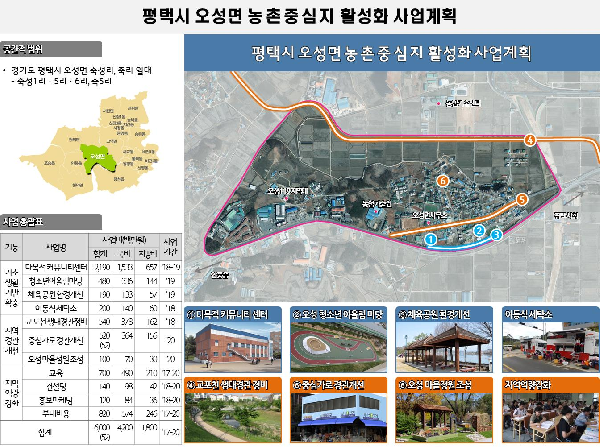 또한 사업계획 수립후 지역발전 전문가와 부시장을 주축으로 발전협의회를 구성하여 보고회 개최 등 사업계획 수정·보완을 거쳐 금년 1월 경기도 및 농림축산식품부에 공모사업 계획서를 작성 제출했고, 경기도 및 농림축산식품부의 발표 평가를 거쳐 지난 9월초 기획재정부 3차 심의결과 오성면 농촌중심지 활성화사업, 팽성읍 대추리 창조적 마을 만들기(종합개발) 현덕면 덕목리 창조적 마을 만들기(중규모), 시군 역량강화 등 4개 사업이 최종 확정됐다.