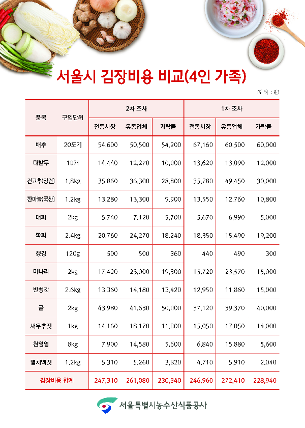 서울시 김장비용 1차, 2차 결과 비교 자료. <사진제공=서울시농수산식품공사> |