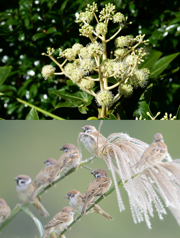 ▲팔손이 꽃과 참새 <사진제공=난대아열대산림연구소> |