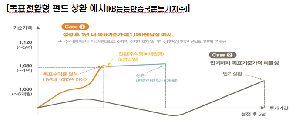 상품의 구조에서도 기존 상품과는 다르게 차별화된 변화를 시도했다.‘목표전환형 + 단위공모형’이 그것인데‘목표전환형’이란 펀드의 목표수익률을 정하고 해당 목표가 달성되는 경우 채권형펀드로 전환해 수익을 확보하는 구조이다.