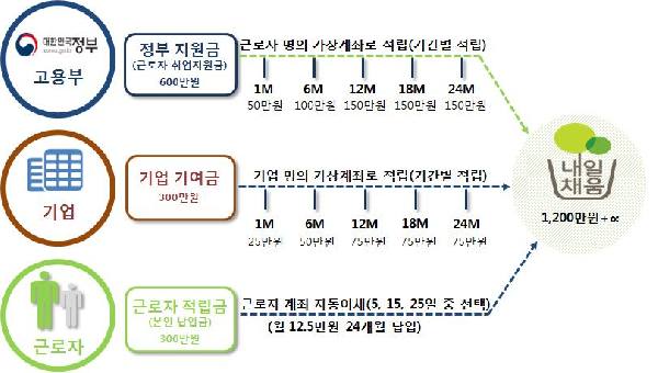 근로자와 중소기업이 2년간 300만원씩을 납입하고, 정부는 2년간 600만원을 지원해서 만기 후 청년취업자는 총 1200만원을 수령할 수 있다. 가입대상은 청년취업인턴제에 참여해 정규직으로 전환된 근로자와 채용 기업이다.