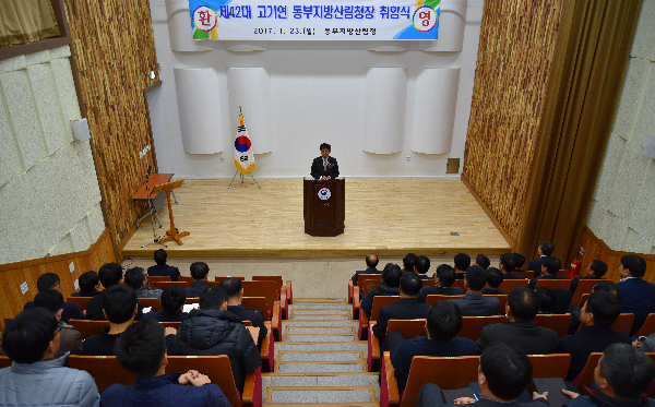 동부지방산림청 대강당에서 1. 23일 오전 10시 지방청 전 직원과 국유림관리소장 등 80여 명이 참석한 가운데 취임식이 진행되었다.