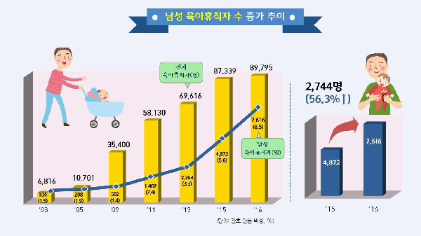[환경일보] 정흥준 기자 = 고용노동부(장관 이기권)에 따르면 지난 해 남성 육아휴직자는 7616명으로 2015년 대비 56.3% 증가했다. 또한 전체 육아휴직자 8만9795명 중 남성의 비율이 2015년 5.6%였던 것에 비해 2.9% 증가해 8.5%를 돌파했다.