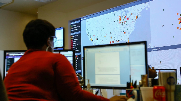SOC는 본부 차원의 서비스 관제소로, 전면 대형 LCD 전광판으로 미국 내 32개 주에 설치된 약 9천대의 노틸러스효성 ATM 작동 현황을 한눈에 관리한다. |