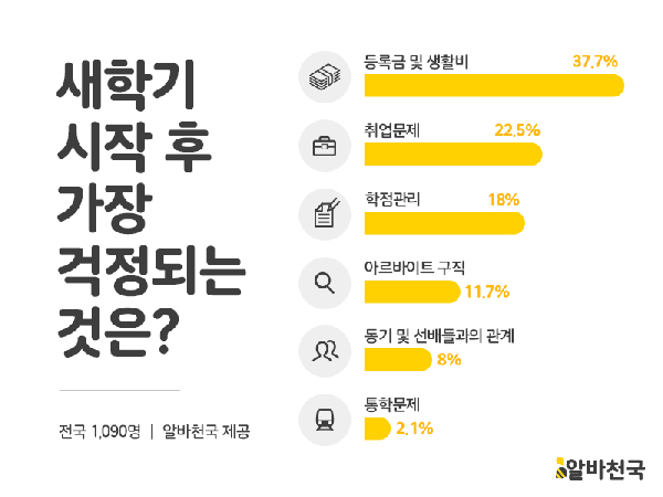 또한 새 학기 시작 후 가장 걱정되는 것으로는 ‘등록금 및 생활비’가 37.7%로 가장 높게 나타났으며 다음으로 ‘취업’이 22.5%를 차지했다.