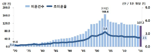 이혼율 역시 2.1건으로 1997년(2.0건) 이후 가장 낮은 수치를 기록했다. 유배우 이혼율(유배우 인구 1천명당 이혼 건수)은 4.3건으로 전년대비 0.1건 감소했으며 연령별 이혼율은 10년 전에 비해 남자 30대 후반에서 35.9%(-4.1건), 여자는 30대 초반에서 35.3%(-4.2건)로 가장 크게 감소했다.