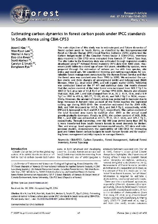 최근 고려대학교 환경생태공학과 이우균 교수와 캐나다 산림청 커즈(Kurz) 박사 연구팀은 우리나라의 국가산림자원조사(National Forest Inventory) 자료와 캐나다 산림청에서 개발하고 국제적으로 신뢰성과 효용성이 검증된 CBM-CFS3 모형을 통해 IPCC(기후변화에 관한 정부간 협의체)가 제안한 국제규격 중 최상위수준(Tier 3)을 만족시키는 우리나라의 산림의 탄소저장량과 생산 가능한 바이오매스 잠재량에 대한 전망을 내놨다.