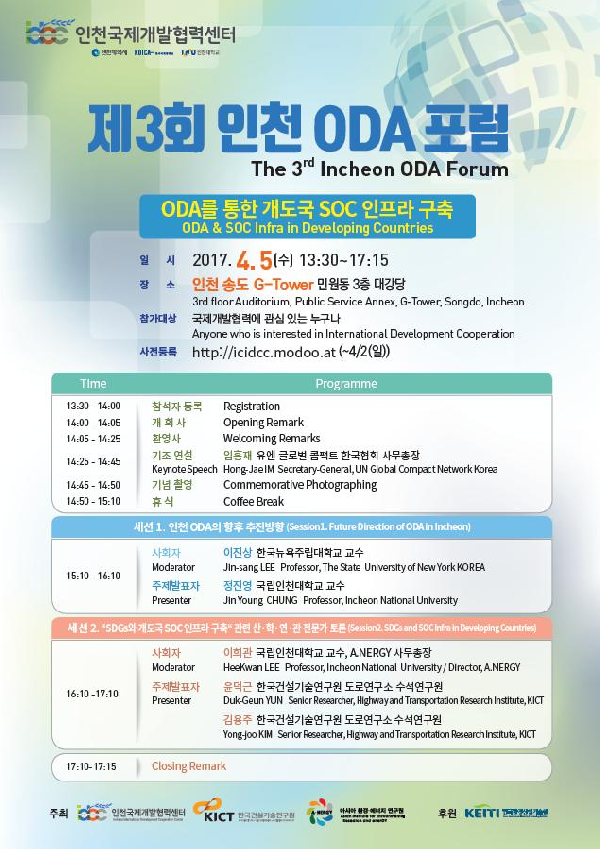 한국건설기술연구원(원장 이태식, 이하 KICT)은 인천국제개발협력센터(IC-IDCC) 및 아시아환경에너지연구원(A.NERGY)과 공동으로 4월5일 오후 1시 30분부터 ‘ODA를 통한 개도국 SOC 인프라 구축’이라는 주제로 ‘제3회 인천 ODA포럼’을 개최한다.