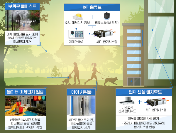 [환경일보] 김승회 기자 = “집안에는 미세먼지 센싱 환기시스템이 항상 쾌적한 공기질을 유지하고, 출입구 옆 에어 샤워룸을 이용해 몸에 붙은 미세먼지와 세균을 제거한다. 어린이 놀이터에는 미세먼지 알람 시스템을 설치해 공기질을 확인하고 단지 내 보행로에 설치된 미스트 분사기가 미세먼지를 잡아준다.”
