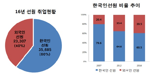 한국인 선원의 취업 동향을 살펴보면 전년(2015년 말 3만6976명) 대비 3.5% 감소, 10년 전(2007년 말 3만8608명) 대비 7.6% 감소해 연평균 약 0.8%씩 지속적으로 감소하는 것으로 나타났다. 반면 외국인 선원의 경우 10년 전(2007년 말 9916명)과 비교해 취업자 수가 1.3배 이상 늘어 연평균 약 13%씩 증가하고 있는 것으로 조사됐다.