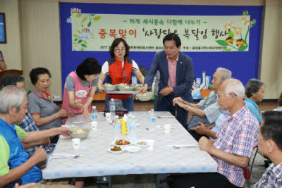 이 자리에는 수원시의회 염상훈 부의장과 유철수 의원도 참석해 음식을 마련한 율천동 지역사회보장협의체 위원과 부녀회원들을 격려하고, 삼계탕을 직접 나르는 일을 도왔다.