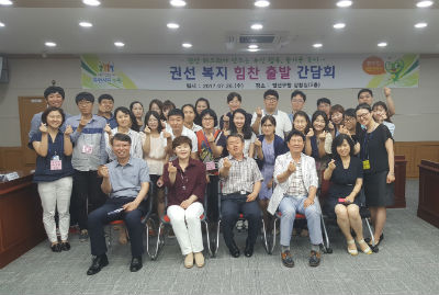 간담회에는 이필근 권선구청장, 조명자 수원시의회 문화복지교육위원회 위원장과, 민한기 위원, 사회 및 가정복지과장이 참석하였으며 이는 7. 17자 동복지허브화 전면시행에 따른 조직개편과 인사이동으로 인한 사회복지 직원 간 소통을 통화여 변화된 복지환경에 신속히 적응할 수 있도록 함으로써 권선 복지 발전을 도모하고자 마련한 자리이다.