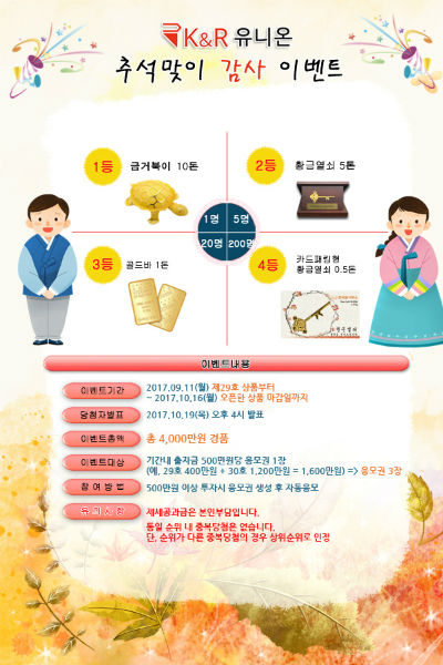 케이엔알유니온은 현재 부동산재테크 출자자를 위해 총 경품 금 155돈의 추석맞이 감사이벤트와 기존 출자이력이 없는 신규회원을 대상으로 300만원 이상 출자시 1% 상품권 리워드 이벤트를 진행하고 있다.