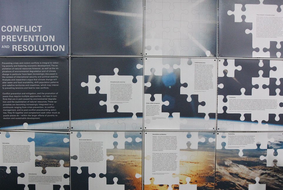향후 송도와 부산에서도 전시 계획을 가지고 있는 이 전시회는 ▷지속가능한 개발과 환경협력은 안정과 평화에 어떻게 기여하는가? ▷환경변화는 인류의 안전을 어떻게 위협하는가? ▷천연자원의 착취는 폭력적 갈등을 초래하는가? ▷안보에 가장 큰 영향을 미치는 지역 기후변화는?에 대한 답을 찾는 4가지 주제로 구성돼 있다.