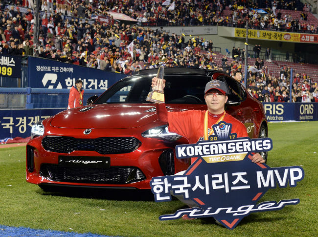 [환경일보] 김승회 기자 = 기아자동차㈜는 지난 30일 서울 잠실야구장에서 열린 한국시리즈 5차전 직후 한국시리즈 MVP로 선정된 양현종 선수(기아 타이거즈)에게 부상으로 기아차의 프리미엄 퍼포먼스 세단 스팅어를 수여했다.