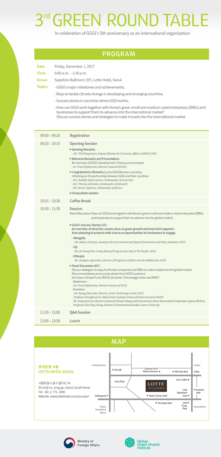 [환경일보] 이창우 기자 = 외교부 녹색환경외교과, GGGI(글로벌녹색성장연구소)가 주최하는 ‘제3차 그린라운드테이블(GREEN ROUND TABLE)’이 오는 12월1일 소공동 롯데호텔에서 열린다.