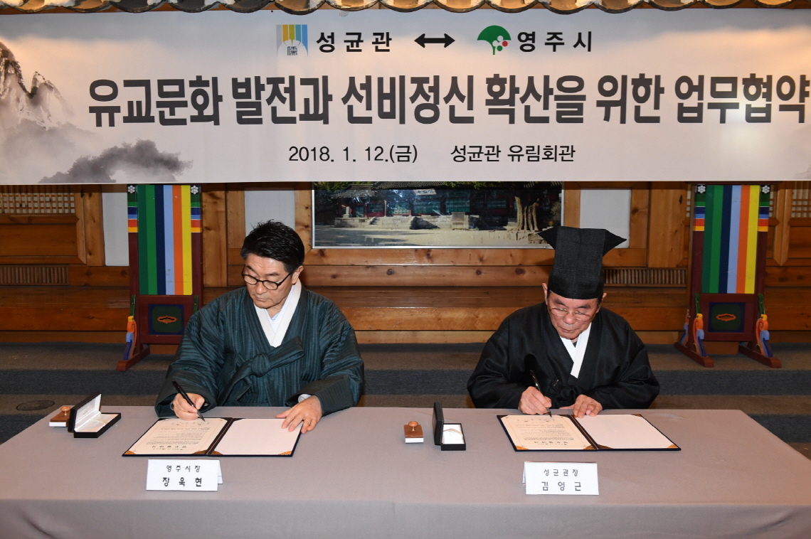 시는 12일 성균관 유림회관에서 김영근 성균관장과 장욱현 영주시장이 만나 유교문화 전승발전과 선비정신 범세계화를 위한 상호교류 및 지원 업무협약을 맺었다.