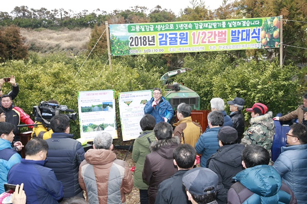 이에 따라 제주시는 31일 조천읍 북촌리 김규식 농가 감귤원에서 고길림 제주시부시장을 비롯해 양용창 제주시농협조합장, 김한종 농업경영인 제주도연합회장, 신만균 농업경영인제주시연합회장, 농․감협, 감귤농가 등 200여명이 참여한 가운데 감귤원 1/2간벌 발대식을 갖고 본격적인 간벌에 들어갔다.