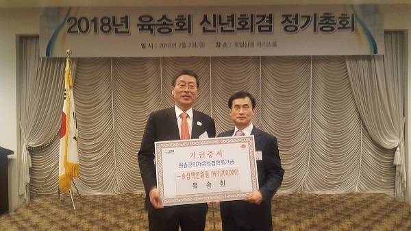 [청송=환경일보] 김희연 기자 = 청송군은 육송회(회장 심창섭)가 지난 2일 서울 삼정호텔에서 열린 신년회 겸 정기총회에서 자라나는 후배들을 위해 써달라며 (재)청송군인재육성장학회(이사장 한동수)에 300만원을 기탁했다고 밝혔다.